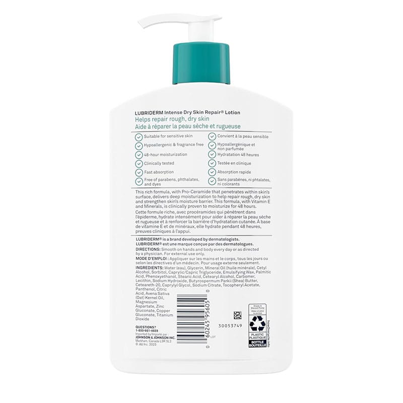 Lubriderm Intense Dry Skin Repair Lotion – 480ml is a dermatologist-developed moisturizer designed to provide long-lasting hydration for rough, dry skin. Enriched with Pro-Ceramide, Vitamin E, and essential minerals, this fast-absorbing, non-greasy lotion helps restore the skin’s moisture barrier, leaving it feeling soft, smooth, and healthy-looking. Clinically proven to moisturize for 48 hours, it is hypoallergenic, fragrance-free, and suitable for sensitive skin.