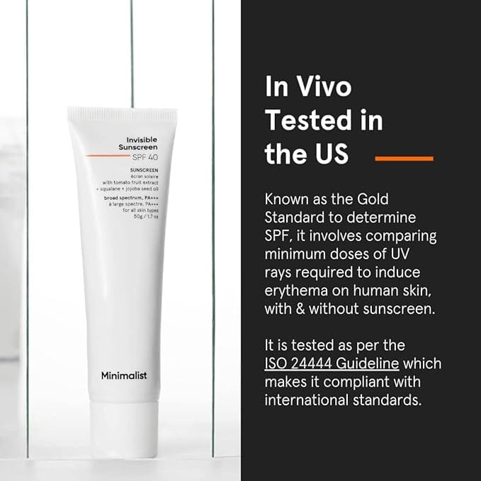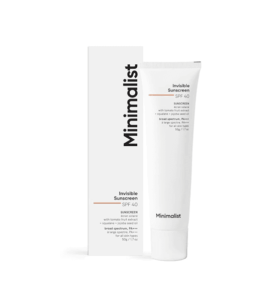 Minimalist Invisible SPF 40 Sunscreen provides lightweight, broad-spectrum sun protection without leaving a white cast, enriched with antioxidants to nourish the skin.