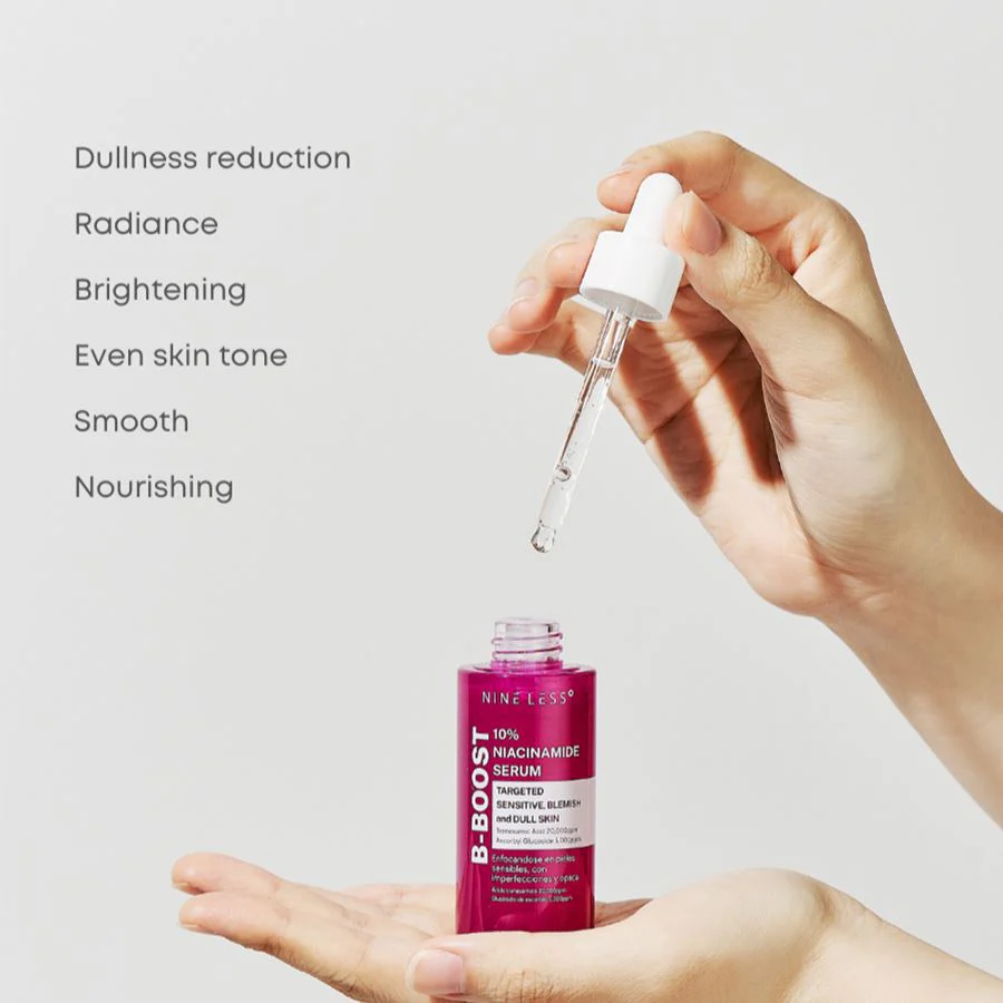 NINELESS B-Boost 10% Niacinomide Serum is a concentrated serum designed to improve the appearance of your skin. It contains 10% niacinamide, also known as vitamin B3, which is known for its numerous benefits for the skin. Niocinamide helps to regulate sebum production, reduce the appearance of pores, and improve skin texture. It also has brightening properties that can help fade dark spots and even out skin tone. Additionally, this serum provides hydration and strengthens the skin?s barrier, resulting in a healthier and more resilient complexion.