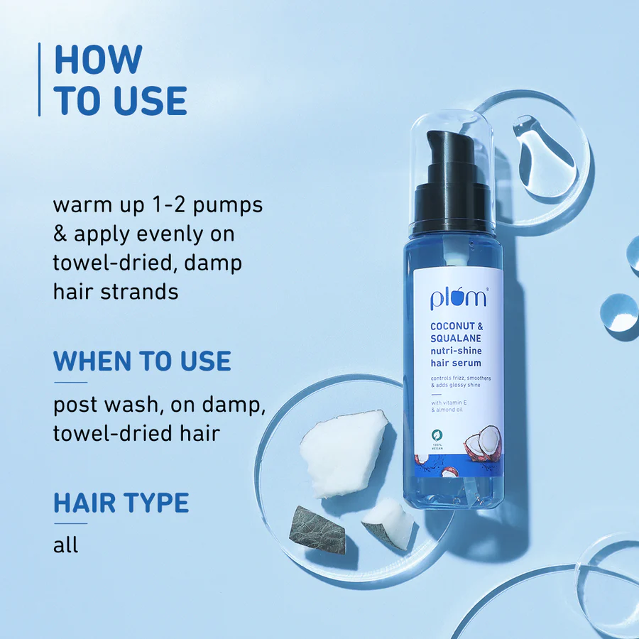 Transform your hair care routine with Plum’s Coconut & Squalane Nutri-Shine Hair Serum?a lightweight, non-greasy formula that delivers instant shine and smoothness. Infused with nourishing coconut oil, hydrating squalane, and conditioning sweet almond oil, this serum tames frizz, reduces flyaways, and detangles hair effortlessly. Ideal for all hair types, it leaves your locks silky, manageable, and luminous without weighing them down. Embrace the power of nature for salon-worthy hair every day