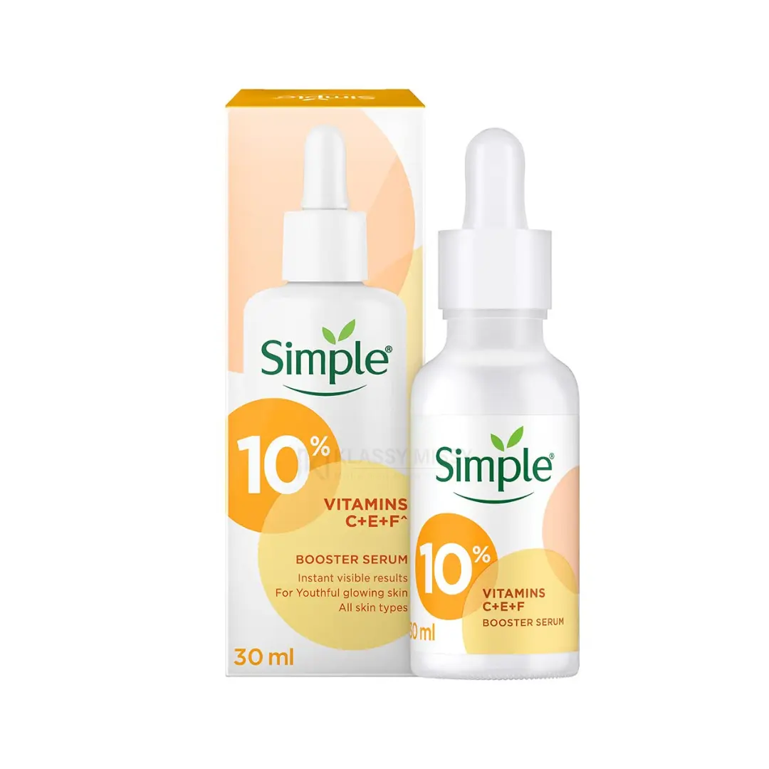 Simple Booster Serum 10% Vitamin C+E+F 30ml brightens, hydrates, and defends your skin, leaving it radiant, even-toned, and healthy.