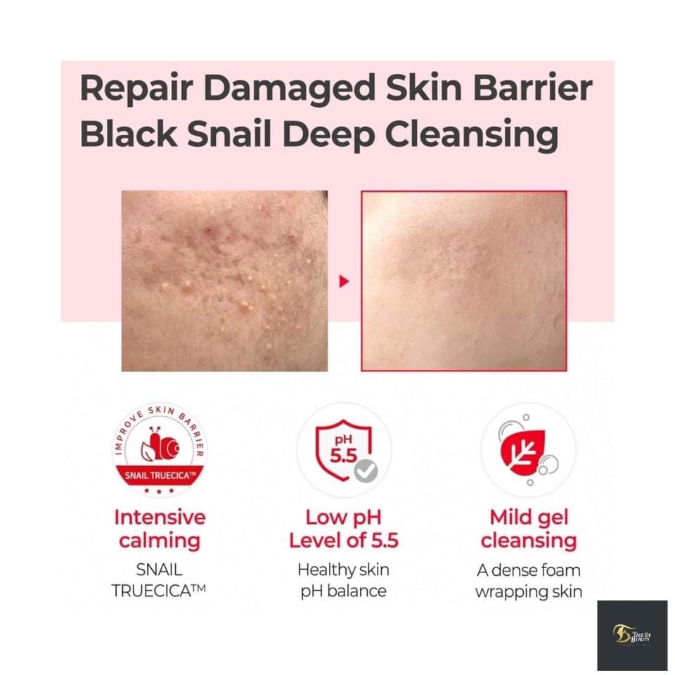 A mild and gentle gel cleanser with low pH value of 5.5. Formulated with black snail extract to heal damaged skin, and enriched with 17 types of amino acids, ceramide and panthenol to strengthen the skin?s moisture barrier, maintaining a plumper and firmer complexion. Forms rich, creamy bubbles that cleanse skin without leaving it dry or irritated. Features a hypoallergenic, moisturizing formula; improves skin?s natural vitality as it soothes with snail truecica; strengthens the skin barrier with snail mucin; soothes as it cleans to remove dirt, excess oil, and impurities without causing dryness